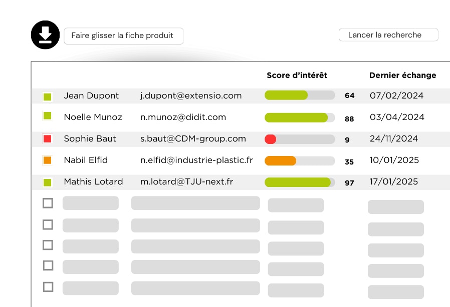 Notre assistant commercial analyse les données de votre prospect (secteur, taille, chiffre d’affaires, SIRET, investissements récents, partenariats) et génère un score de “qualification” par rapport à votre offre. Vous devez simplement décrire votre offre et les profils client susceptibles d’être intéressés. Cela est particulièrement utile si vous lancez de nouveaux produits et souhaitez tester leur pertinence auprès de votre base de données clients existante, ou si vous cherchez à entrer en contact avec des prospects identifiés lors d’un événement.